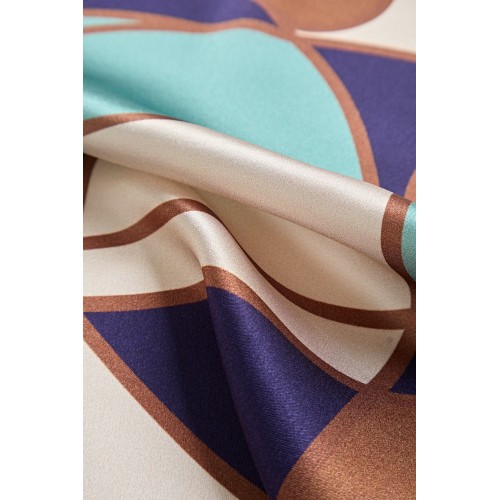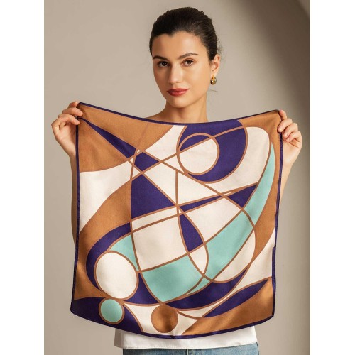 This pure silk scarf offers a luxuriously smooth touch. enhancing your style with its soft. silky texture. Its compact square size is perfect for easy portability. making it a versatile accessory. The design combines bold geometric shapes with graceful curves. creating a stunning balance of structure and fluidity for a truly unique. fashionable statement.