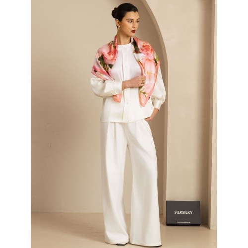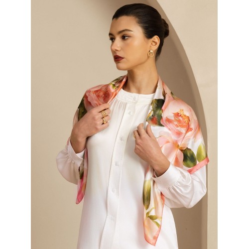 Crafted from luxurious silk for a smooth. premium feel. Features a delicate floral print that adds timeless charm. Perfectly sized for versatile styling as a neck scarf. headscarf. or bag accessory. An elegant and thoughtful gift for any occasion. blending fashion and sophistication seamlessly.